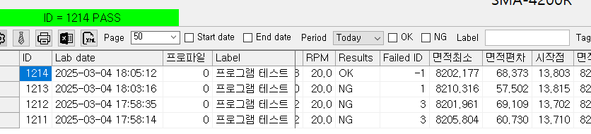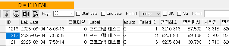역시 에러가 발생했지만 이 경우 면적 최소 판정의 우선순위가 높기때문에, 에러코드가 1이 기록되었습니다. 마지막으로 모든 측정 결과가 양품이 나오도록 면적 최소값을 8000으로 돌리고, 시작점 조건을 10도와 15도 사이로 설정해봅시다.