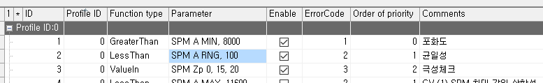 | Profile Id | 측정 프로파일의 Id 입니다. 만약 1번 프로파일을 이용하여 측정하였다면, Id가 1인 아이템을 이용하여 양불 판정을 수행합니다. |